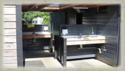 toiletten, drie douches,twee wasplaatsen en twee afwasplaatsen aanwezig. In de